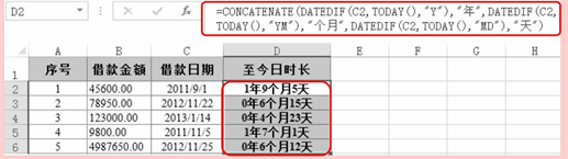 =CONCATENATE(DATEDIF(C2,TODAY(),”Y”),”年”,DATEDIF(C2, TODAY(),”YM”),”个月按“Enter”键即可得到第一项借款的借款日期至今日的时长。