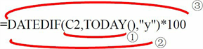 =DATEDIF(C2,TODAY(),”y”)*100