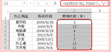根据办公用品的购买时间可以统计出其已使用年数。