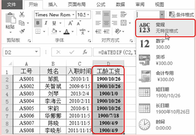 ➋ 将光标移到D2单元格的右下角,光标变成十字形状后,按住鼠标左键向下拖动进行公式填充,即可返回其他员工的工龄工资,保持工龄工资日期值的选中状态,依次选择“开始”→“数字”→“常规”格式,如图4所示。