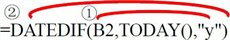 =DATEDIF(B2,TODAY(),”y”)
