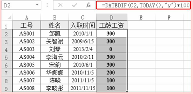 表格中显示了员工的入职时间,现在要求根据入职时间计算出工龄工资,本例规定:员工工作时间每满一年,工龄工资将自动增加100元。