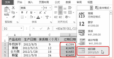 ➋ 将光标移到D2单元格的右下角,待光标变成十字形状后,按住鼠标左键向下拖动进行公式填充,即可得出其他食品的保质期,保持过期日期列的选中状态,选择“开始”→“数字”→“短日期”格式,如图1所示。