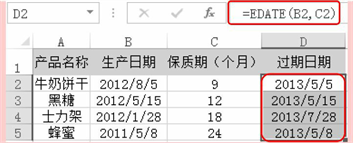 按“Enter”键即可根据产品的生产日期和保质期计算出过期日期(这里的日期格式为默认的常规格式)。