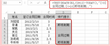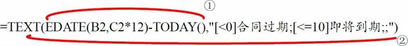 =TEXT(EDATE(B2,C2*12)-TODAY(),”[<0]合同过期;[<=10]即将到期;;”)