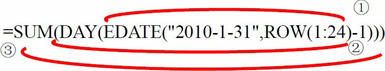 =SUM(DAY(EDATE(“2010-1-31”,ROW(1:24)-1)))