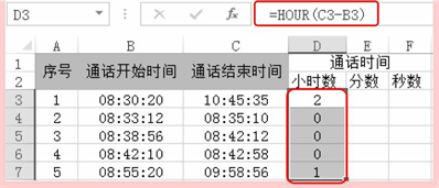 本例表格显示了通话的开始时间与结束时间,将其小时数进行减法运算即可求解出通话的小时数。
