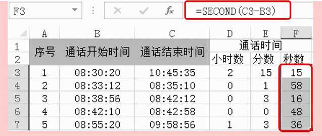 本例表格显示了通话的开始时间与结束时间,将其秒数进行减法运算即可求解出通话的秒数。