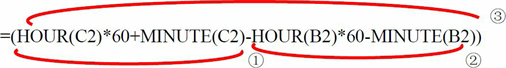 =(HOUR(C2)*60+MINUTE(C2)-HOUR(B2)*60-MINUTE(B2))