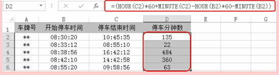 ➋ 将光标移到D2单元格的右下角,待光标变成十字形状后,按住鼠标左键向下拖动进行公式填充,即可返回其他停车记录的分钟数,如图3所示。