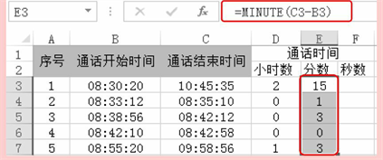 本例表格显示了通话的开始时间与结束时间,将其分钟数进行减法运算即可求解出通话的分钟数。
