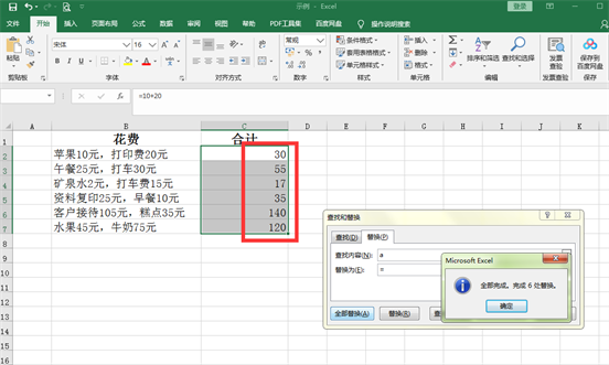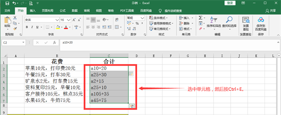 然后,和上面一样,选中单元格,然后按Ctrl E,金额就被提出出来了,最后只需要把“a”替换成“=”看看会是什么效果!