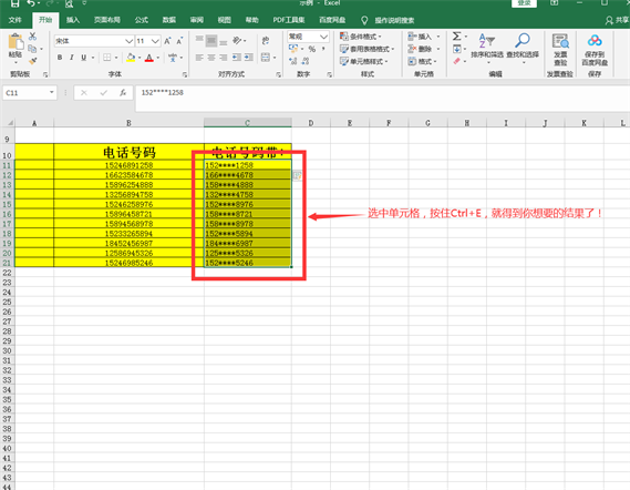 然后,选中数据单元格,按Ctrl E,快速得到你要的结果!就算你不会用函数,也没问题了!身份证号码替换同理。