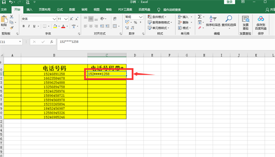 首先,我们打开数据,然后在单元格中输入:152****1258,(你想隐藏几个数字就从第几个数字开始用*表示),