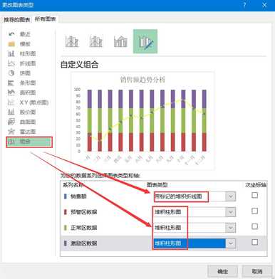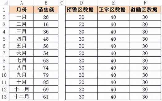 分别添加预警区数据、正常区数据、激励区数据三个数据系列