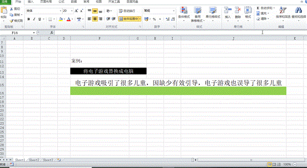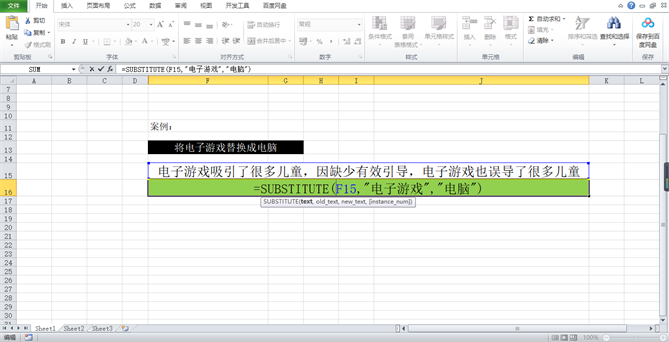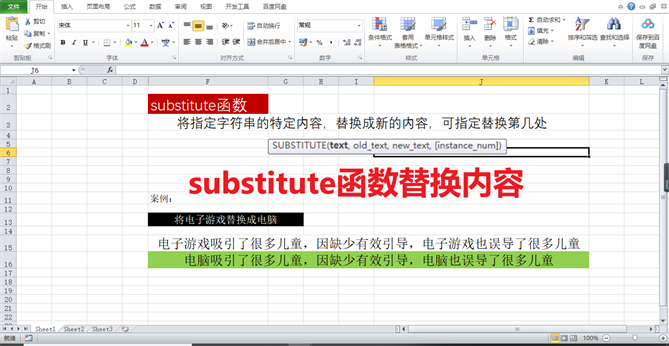 如图二所示,这样的一个计算过程,我们将指定的字符“电子游戏”替换成“电脑”,我们的一个要求就是对文本中所有的电子游戏都给替换成电脑,我给各位演示了一下,小伙伴们可以仔细看一下我们的操作过程,这样的一个函数在Excel中的应用不多,大家只需要理解即可,给大家看一下这样的一个函数输入方式。