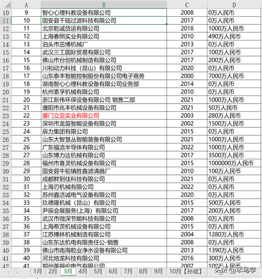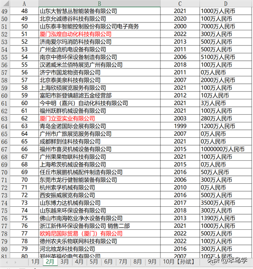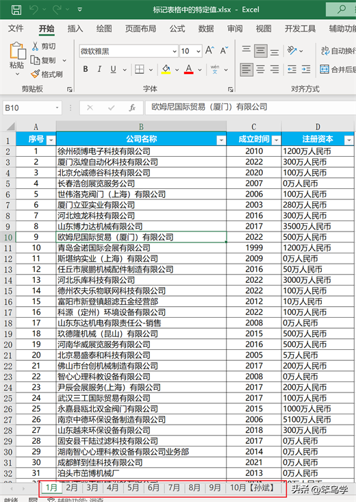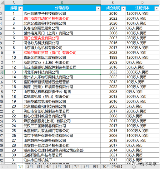 现在的问题是从这些表格中找到特定的公司名称,并标记,例如,找到包含厦门的公司名称,并将字体标记为红色。