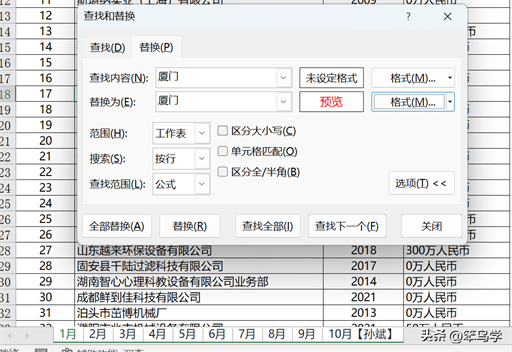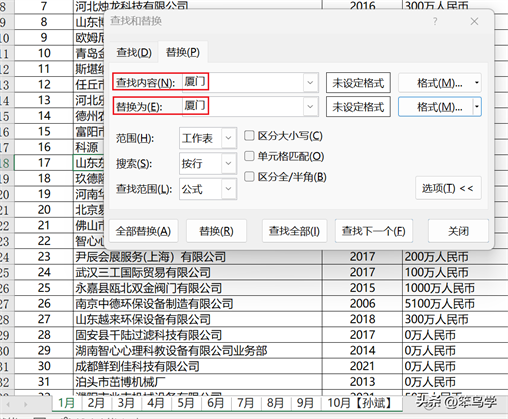 最直接的想法是通过Excel中的查找功能,即在一个表格中,Ctrl F,查找“厦门”,这样就会得到这个表格中所有包含厦门的公司名称,然后将查找结果的字体一个一个地标记为红色。