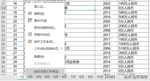 首先,选中所有工作表,在一个表格上右击鼠标,选择【选定全部工作表】,如下图所示。