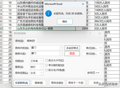然后,Ctrl H,调出【查找替换】对话框,查找内容为厦门,替换内容也为厦门,如下图。