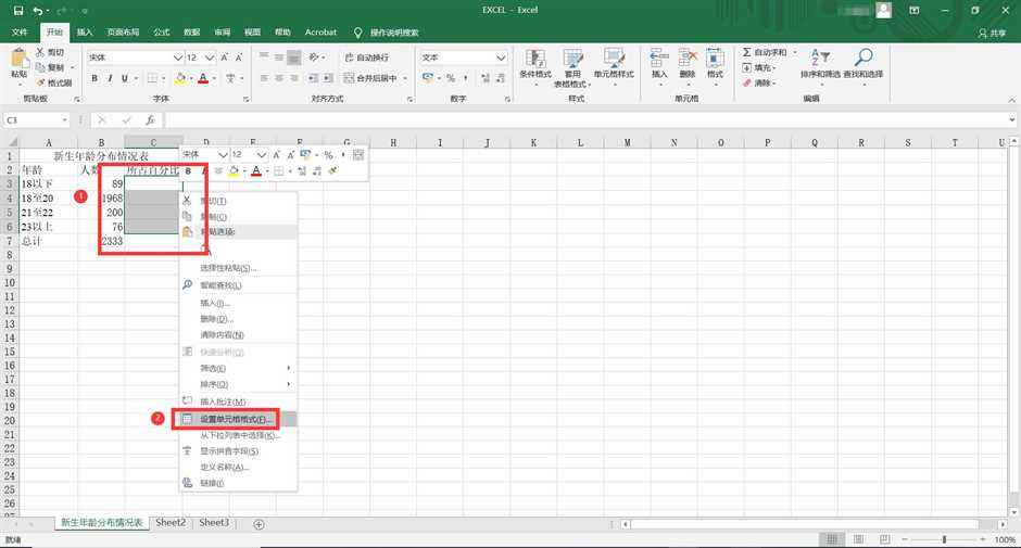 4.计算所占百分比前,先设置单元格格式,选中需要己算百分比的单元格,点击【设置单元格格式】。