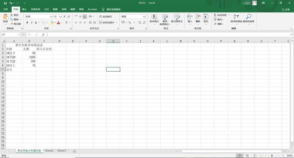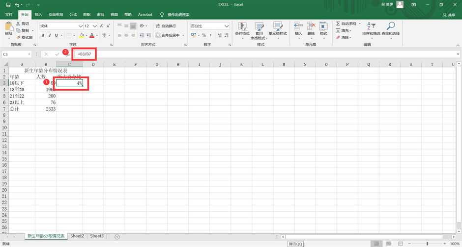 6.点击单元格,输入公式【=b3/b7】,意思是【所占百分比=人数/总人数】。