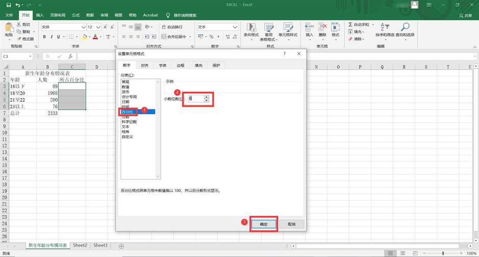 5.选择【百分比】,可以设置小数点位数,这里设置【0】。