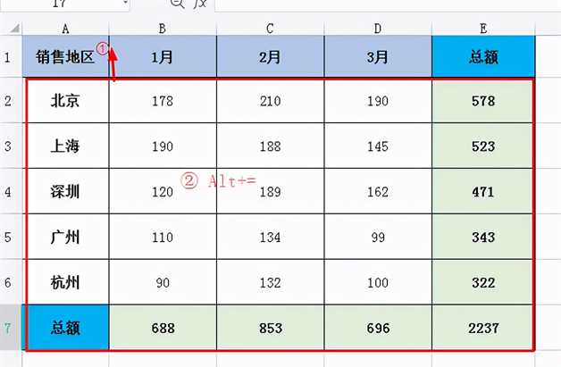 3、此时在按快捷键【ALT+=】,即可完成自动求和。