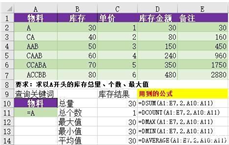 当我们在第三个参数,如实例,输入A的时候, 实际上,计算的是以A开头的所有物料的库存DSUM函数,计算以A开头的所有库存的和dcount函数,计算以A开头的物料的个数dmax函数,计算以A开头的物料的库存的最大值dmin函数,计算以A开头的物料的库存的最小daverage函数,计算以A开头的物料的库存的平均值特别提醒,是以A开头,不是单元格值等于A!!!!在第二个参数,我们这里输入的是2,是因为返回的值,在条件区域的第二列,当然我们可以直接输入B2,就是列号也是可以的用法2:不以A为结尾,的符合条件的值,主要为中间,或是首字母为A,如果末尾为A,只要中间有A这个字符,也是符合条件的