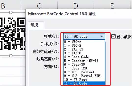 EXCLE默认的条码样式,一共有11中类型,这个包括国内常用的以及其他国家常用的,当然,都是国际让认可的条码样式,在我们实际工作中,是需要根据实际情况进行选择的,而二维码,用的是第11中,QR code