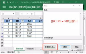1、在筛选状态下,选择2月份的单元格,按CTRL G,弹出窗口,点击定位条件。