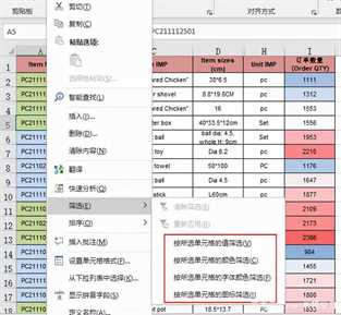 如上图所示,右击单元格的菜单中有筛选选项,而且给出了四种不同的筛选条件,比如按值筛选,按颜色筛选等。