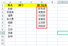 一、如下图所示,在D列单元格中输入需要制作下拉列表的部门信息;