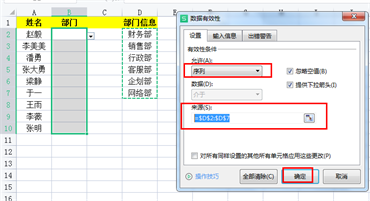 三、在弹出的【数据有效性】对话框中,单击【允许】下方的下拉按钮,选择【序列】,在【来源】下方的选择区域中选择部门信息所在的单元格【=$D$2:$D$7】,最后单击【确定】按钮;