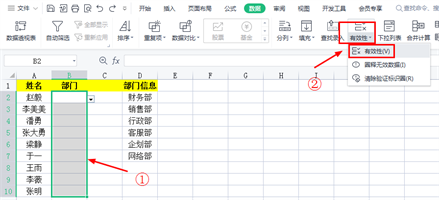 最佳答案示例图:操作步骤:一、如下图所示,在D列单元格中输入需要制作下拉列表的部门信息;二、选择要添加下拉列表的【B2:B10】单元格区域或者整个B列单元格区域。然后在【数据】选项卡的功能区中单击【有效性】中的【有效性】图标;三、在弹出的【数据有效性】对话框中,单击【允许】下方的下拉按钮,选择【序列】,在【......