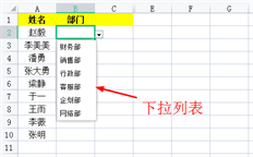 四、这时候,选择部门列中的任意一个单元格,就可以使用下拉列表来快速选择数据了。