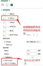3、选择趋势线,点击线性与显示公式,且显示R平方(越接近1表明数据相关性越高,预测越准确)