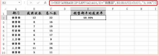 表格中统计了各个部门的获奖次数和总人数,配合IF、TEXT和LEFT函数可以统计出指定部门的平均获奖率。本例以计算销售部人员的平均获奖率为例。