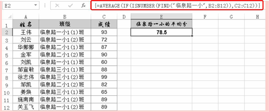 =AVERAGE(IF(ISNUMBER(FIND(“临泉路一小”,B2:B12)),C2:C12))