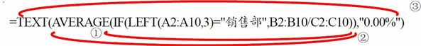=TEXT(AVERAGE(IF(LEFT(A2:A10,3)=”销售部”,B2:B10/C2:C10)), “0.00%”)