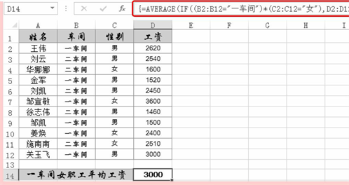 =AVERAGE(IF((B2:B12=”一车间”)*(C2:C12=”女”),D2:D12))