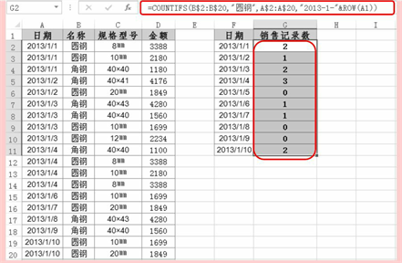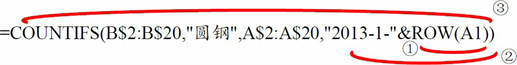 =COUNTIFS(B$2:B$20,”圆钢”,A$2:A$20,”2013-1-“&ROW(A1))