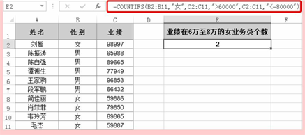 实例1 统计业绩在6万到8万之间的女业务员个数