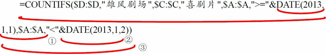 ③ 第一个条件为在D列中寻找“雄风剧场”,第二个条件为在C列中寻找“喜剧片”,第三个条件为判断A列中日期大于等于“2013-1-1”,第四个条件为判断A列中日期小于“2013-1-2”。用COUNTIFS函数统计出同时满足这4个件的记录条数。