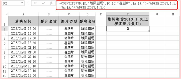 =COUNTIFS($D:$D,”雄风剧场”,$C:$C,”喜剧片”,$A:$A,”>=”&DATE (2013,1,1),$A:$A,”<“&按“Enter”键,即可统计出“2013-1-1”这一天“雄风剧场”放映的“喜剧片”数目,如图2所示。