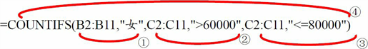 =COUNTIFS(B2:B11,”女”,C2:C11,”>60000″,C2:C11,”<=80000″)
