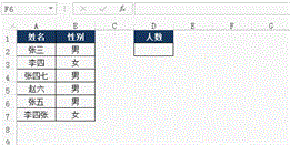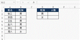 E2单元格的公式为:“=COUNTIF(B:B,D2)”,返回的是B:B中,与D2单元格内容相同的单元格数量,即性别为“男”的数量。