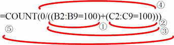 =COUNT(0/((B2:B9=100)+(C2:C9=100)))