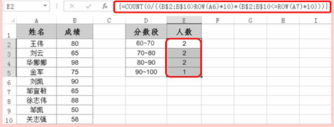 按“Shift+Ctrl+Enter”组合键得出“60~70”分数段的学生人数。