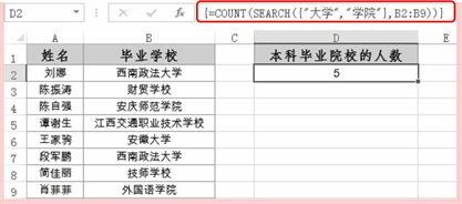 =COUNT(SEARCH({“大学”,”学院”},B2:B9))